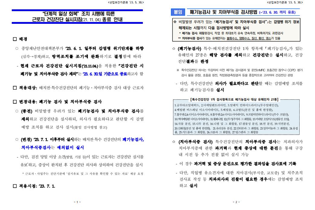 ○ (변경) ‘23. 7. 1. 이후부터실시하는배치전·특수건강진단의폐기능검사, 치아부식증검사는예외없이 실시