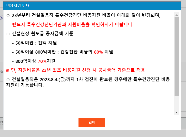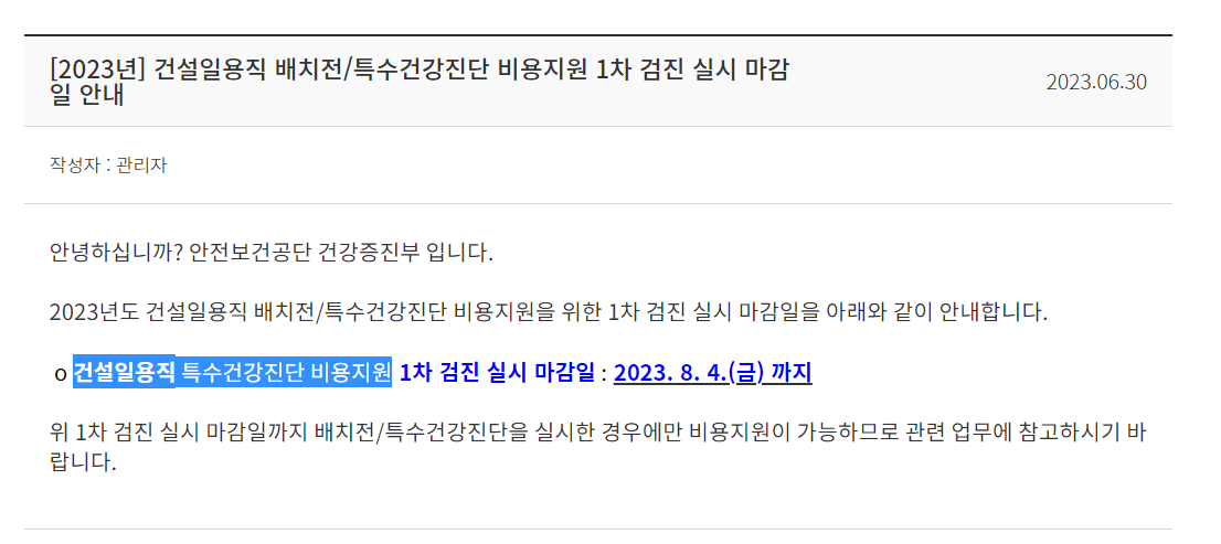 2023년도 건설 일용직 특수건강검진 비용을 지원해주던 국가 사업인 건강 디딤돌사업이 8월중으로 마감된다고합니다.