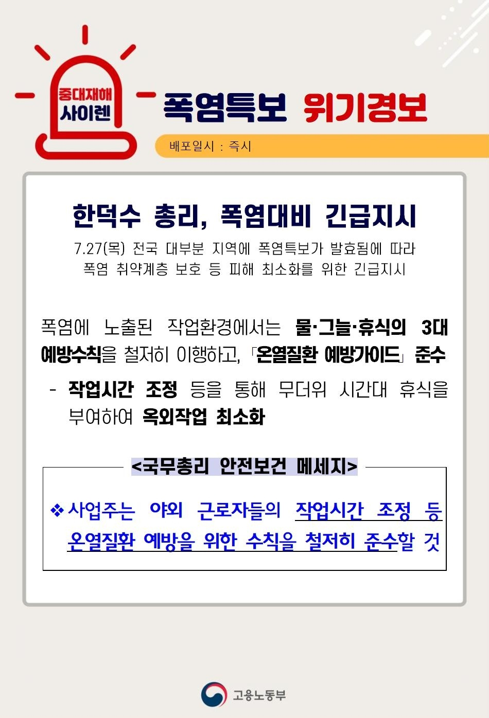 고용노동부에서 전국 대부분 지역에 폭염특보가 발표됨에따라 폭염 취약계층 보호 등 피해를 최소화하기위한 긴급지시를 하였습니다.
