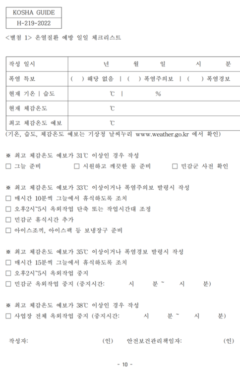 1. 안전보건공단 코샤가이드 '일사병 등 온열질환 예방지침'별표에 나와있는 온열질환 예방 일일 체크리스트를 작성합니다.