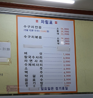 메뉴판입니다. 저희는 수구리전골 소에 버섯을 추가했습니다.