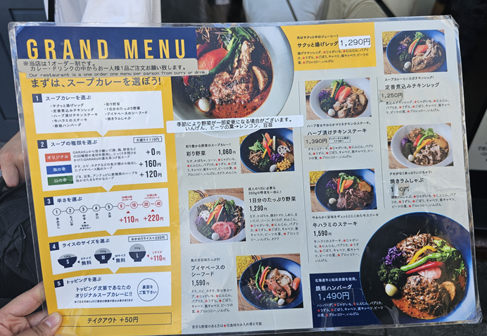 저는 1250엔짜리 허브 훈제닭을 먹었고, 오리지널카레, 맵기는5단계, 밥양은 소, 구운브로콜리와 밥에 치즈를 추가했습니다.