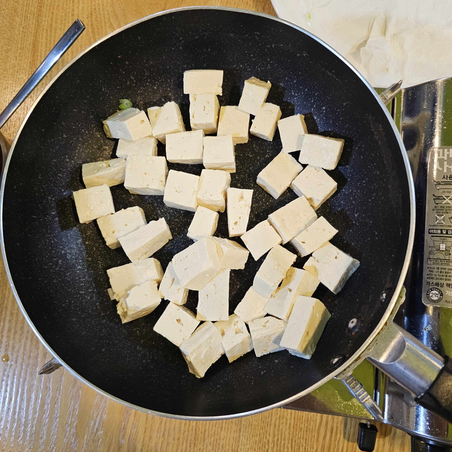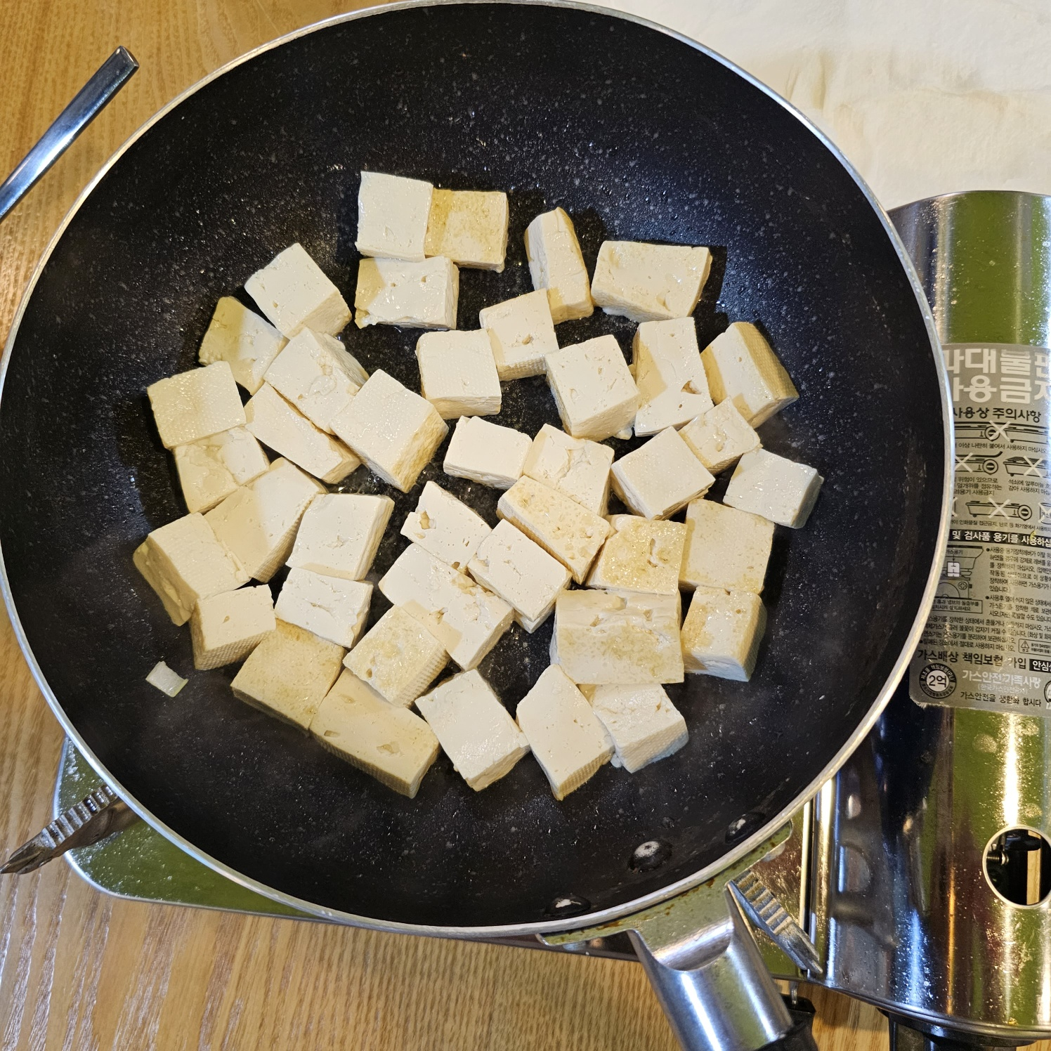 5. 팬에 두부를 넣고 입히면서 수분을 제거해주세요. (기름 튀는 위험 방지할수있음)