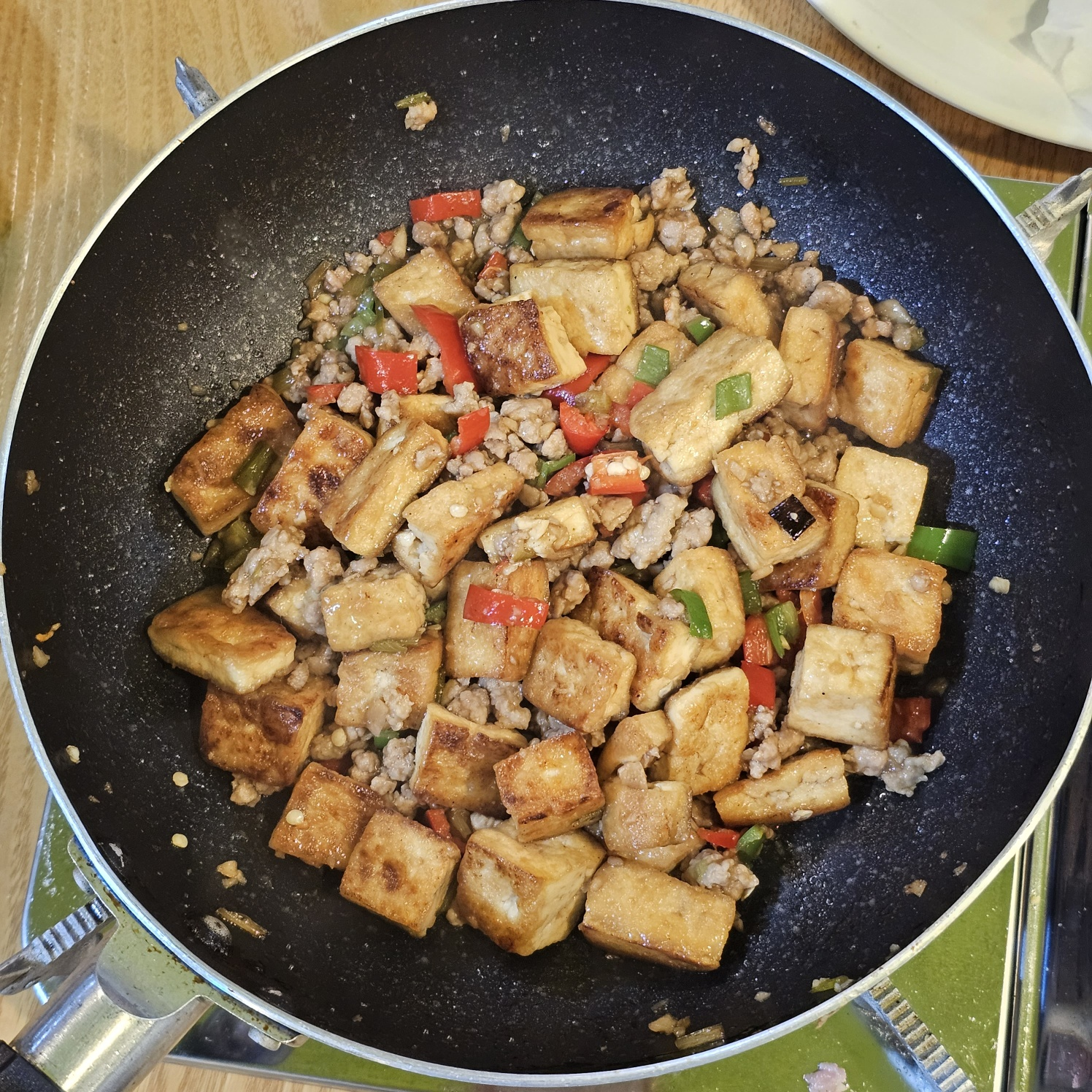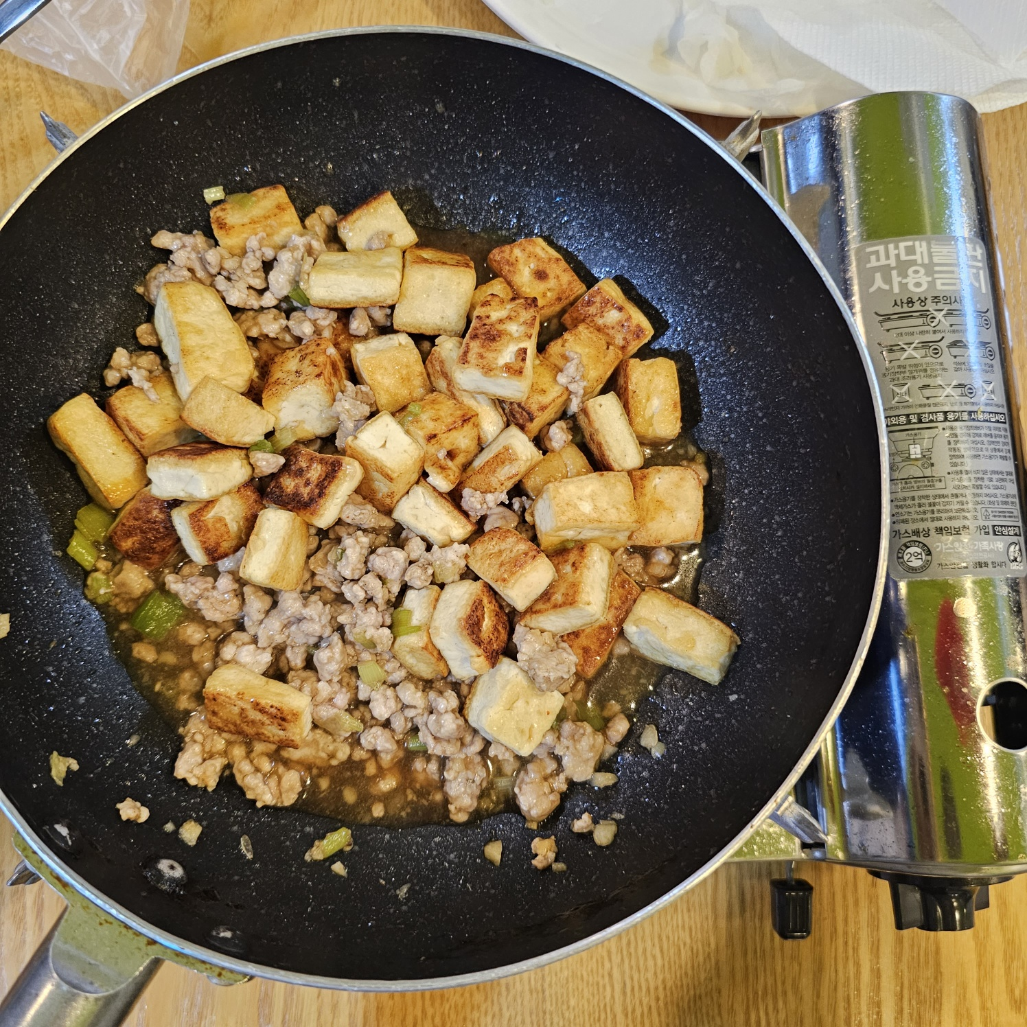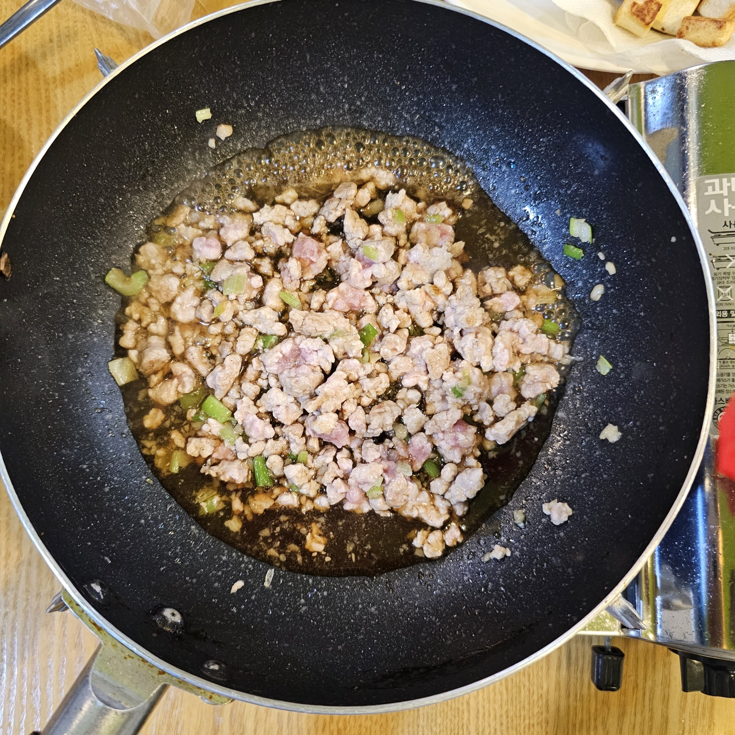 8. 돼지고기를 넣고 볶다가 고기가 어느정도 익으면 양념을 붓고 천천히 저어주다가 끓어오르면 두부를 넣어주세요