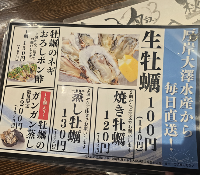 아래에 1200엔은 굴 한솥, 130엔은 찜굴1개, 120엔은 구운굴1개 100엔은 생굴1개입니다.