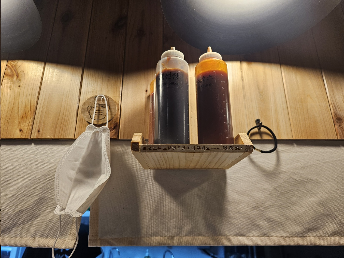 왼쪽에는 마스크걸이 오른쪽에는 머리끈걸이가 있어요