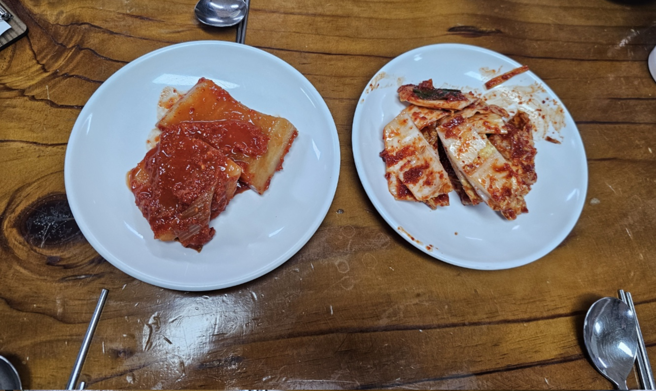 마늘이 많이들어간 김치인데 자극적이지않고 칼국수와 잘어울리는맛이예요