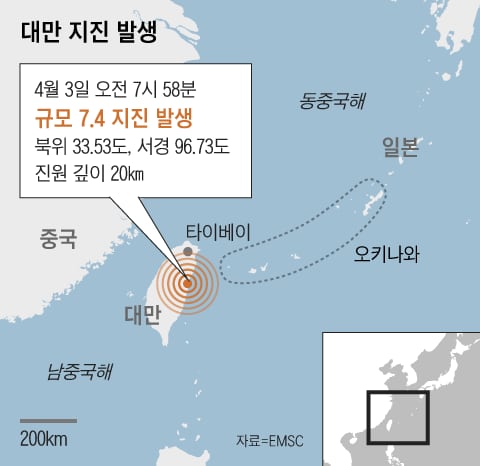 3일 오전 7시 58분 대만 동부에서 규모 7.4의 지진이 발생했다고 유럽지중해지진센터(EMSC)가 밝혔다.