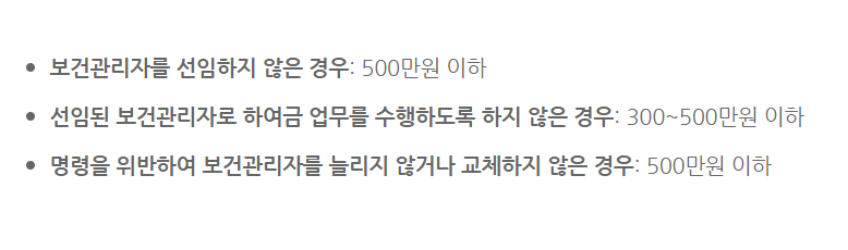보건관리자를 선입하지 않은 경우, 업무를 수행하지 않은 경우 등 횟수에 따라 과태료가 부가됩니다.