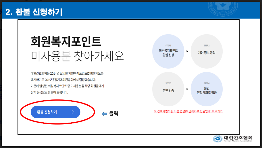 2014년 도입한 회원복지포인트 제도를 폐지하기로2019년 정기대의원총회에서 결정했습니다.기존에 발생된 회원복지포인트 중 미사용분에 대해선 해당 회원들에게 전액 현금으로 환불해 드립니다.아직 현금으로 환불 받지 못하신 분들은 환불신청 프로그램★(pb.kna.or.kr)로그인 후 신청해 주시기 바랍니다.