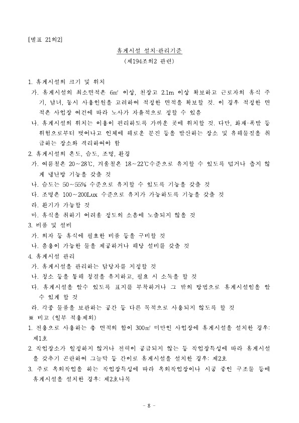이때 휴게시설은 크기, 온도, 조명 등 고용노동부령으로 정하는 휴게시설 설치 관리 기준을 반드시 준수해야합니다
