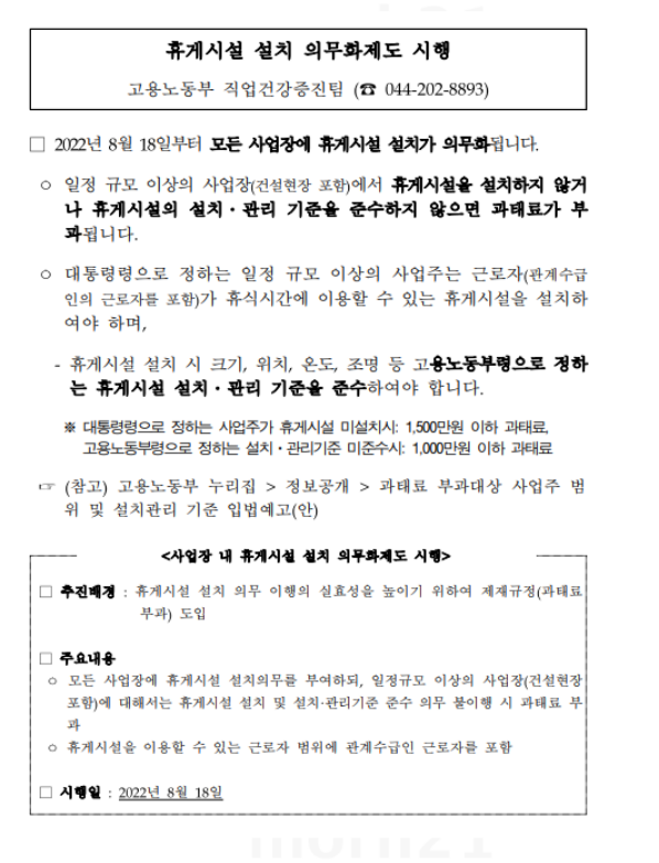상시근로자가 20명이상이라면 그리고 건설업의 경우 공사금액이 20억 이상이면 휴게시설 설치 의무화 제도 적용 대상